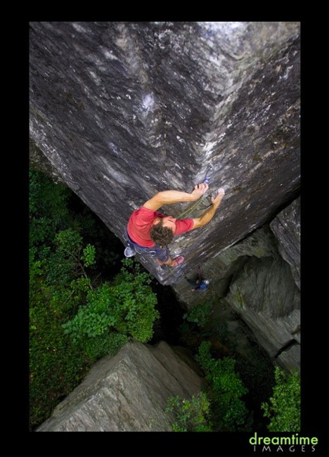So Ben took us to this hole and we were astounded. We stared awestruck at the arete wondering if it would go. We figured it was possible, but damn hard. Maybe 5.14 or so. There didn’t seem to be any holds, but we had to take a closer look. Since we couldn’t figure out how to get to the bottom of pit, we installed a rappel anchor on the side of it and threw a rope down, eyeballing and cleaning an easy line adjacent to the arete. Since the hole is so deep, steep and narrow, we actually couldn’t even see the bottom. I rapped in first and wondered if I was the first human ever to set foot down there. As I descended, I encountered walls carpeted with mosses, ferns, lichens and molds. It was nuts. The bottom was dank, wet and really green, and it was blanketed in a 2-foot-deep layer of peat. Waaaaaaaayyy cool. I eyeballed that arete, and to my surprise there actually were holds. Maybe that line could go. Maybe. But I still figured it would be at least 5.13. Hmm.