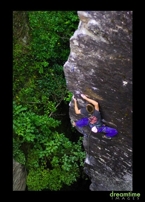 Freeloader, 5.12b/c, 7 bolts. Hyper classic! Sustained climbing on a striking overhung arete to hard cranking on a subtle, crimpy face. Described by the third, fourth and fifth ascentionists as “the best route in Wanaka,” “the best sport climb in New Zealand,” and “the best, most sustained arete I’ve ever climbed anywhere.” Rap into a double bolt belay 30′ from the bottom of the hole, pull through a traverse and charge up the arete’s slopers and crimps, all the while teetering over the 100-foot-deep abyss. Equipped/First Ascent by Nathan Welton and Pierre Boissier, March 2007.