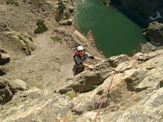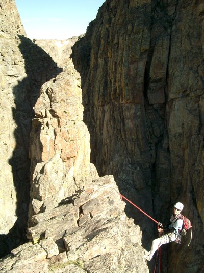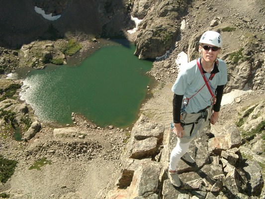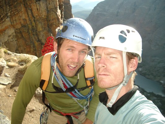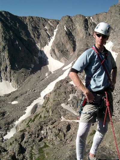 I’m sure anyone who was hiking around Sky Pond a few Mondays ago would have seen me and my buddy Chris halfway up the Petit Grepon looking like a couple of uberdorks. So if you were out there, yep, that was me up there. The guy in the white tightpants. Actually, Chris didn’t look like an uberdork, but he was guilty by association. Here we are: