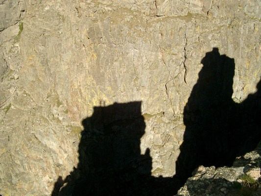 What makes the Petit Grepon so rad is its last pitch and its summit. As you climb up that last section, you eventually find yourself on the knifeblade. It’s about 8 feet wide or so. On your right is a not-so-steep 5.7 face that goes 900 feet to the ground. On your left is a vertiginous, overhung valley that’s another 900 feet straight down. Like, if you dropped a pebble off , it wouldn’t hit the wall on the way down. Then you top out onto this little itty bitty summit that’s no bigger than a minivan, and it overlooks a lot of stuff up there. Way cool. You can see us waving at our shadows in the next pic, and then you can see me rapping off. It’s 4? 5? 6? I forgot double-rope raps all the way to the ground. Couldn’t be easier. Up and down by 9 am. Is verrry niicce!